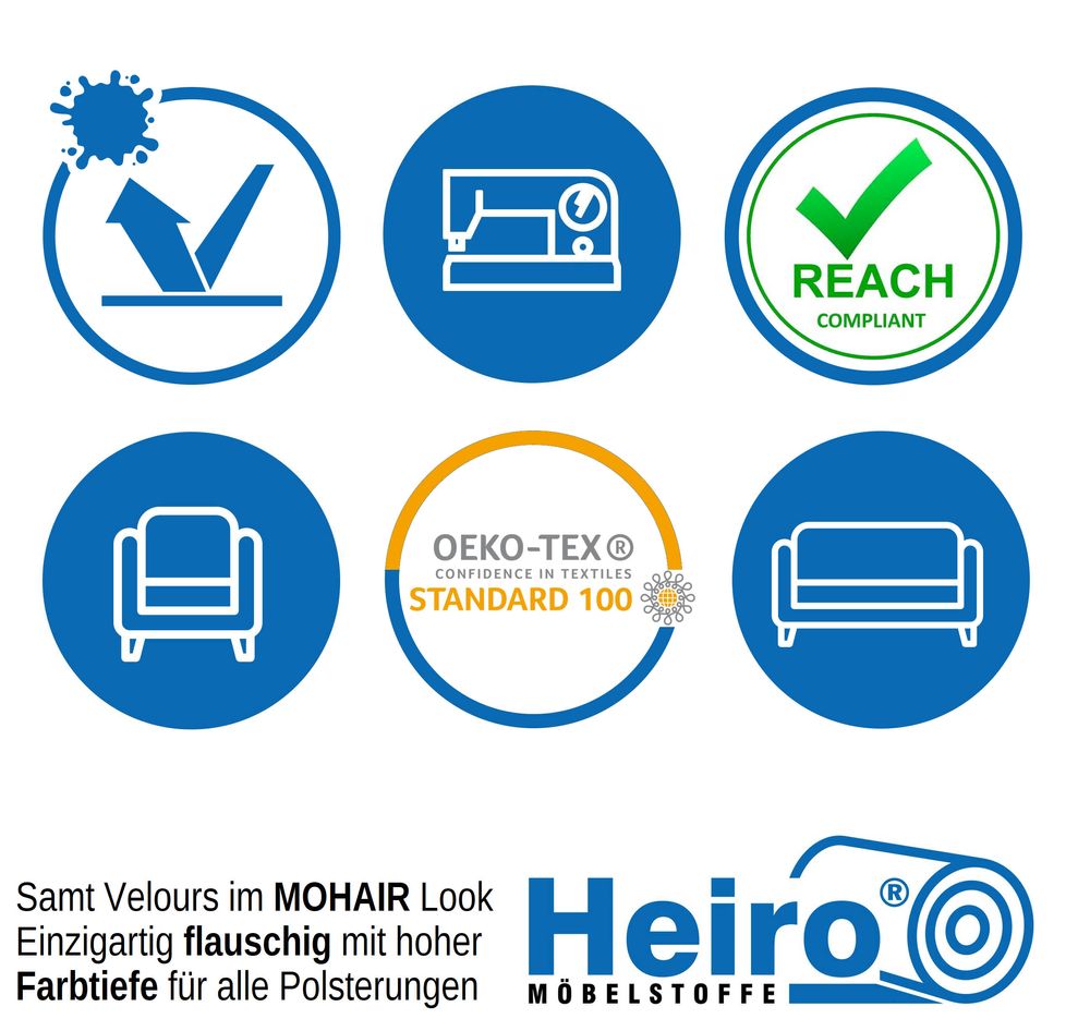 Mohair Look ist ein Samt Velours Polsterstoff, welcher sich in erster Linie durch seine extrem weiche Haptik auszeichnet.