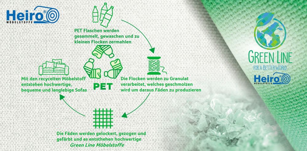 Das was sonst unsere Natur und Ozeane verschmutzt hätte, wird im nächsten Moment zu einem modernen Microfaser Möbelstoff, mit dem gewissen umweltfreundlichen Extra. Die Heiro Green Line Möbelstoffe werden aus recycelten PET Flaschen hergestellt und benötigen bei ihrer Produktion nur ein Bruchteil der Energie, die normalerweise für die Produktion eines Möbelstoffes benötigt wird.