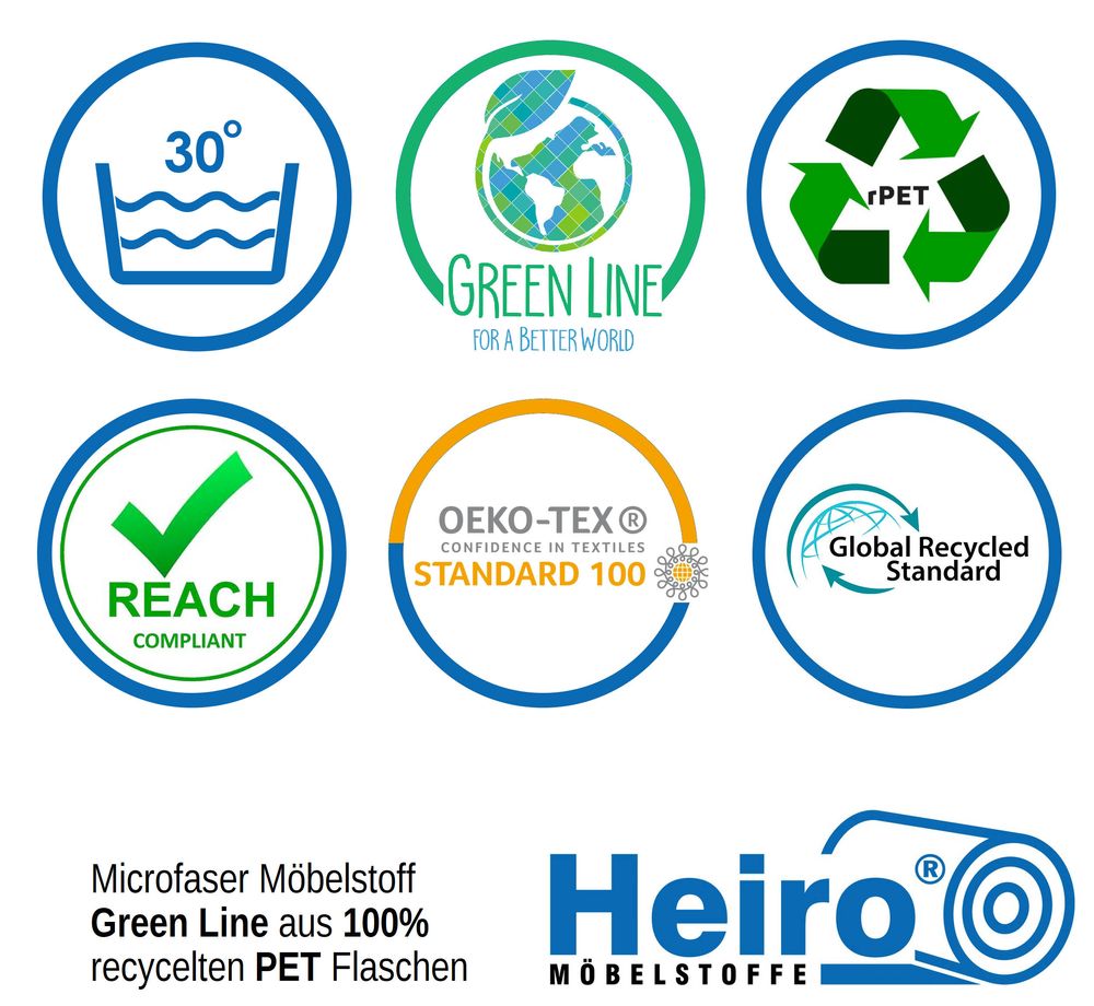 Die Microfaser Möbelstoffe der Heiro Green Line Serie sind sehr widerstandsfähig, robust, langlebig und besitzen eine extrem weiche, samtartige Haptik. Recycelte Möbelstoffe sind ein Lösungsansatz für unser massives Kunststoffproblem. Hinsichtlich der Qualität ist Polyester, gewonnen aus Plastikflaschen, perfekt für Möbelstoffe geeignet. Der Möbelstoff entspricht dem hohen Öko-Tex Qualitätsstandard und ist dementsprechend zertifiziert nach dem STANDARD 100 by OEKO-TEX®. Zusätzlich ist er auch nach dem internationalen Global Recycled Standard zertifiziert, welches sicherstellt dass die sozialen, ökologischen und chemischen Vorschriften in der Produktion erfüllt wurden. Der Möbelstoff wurde positiv auf die Widerstandsfähigkeit gegen Haustiere getestet, was bedeutet, dass er den Kratzspuren von üblichen Haustiergebrauch standhält.